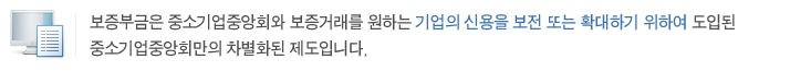 - 「기업보증공제」는 기본적으로 기업의 신용만으로 보증거래가 가능하지만, 보증한도의 확대, 보증요율의 할인 또는 자금운용의 일환으로 보증부금 납입을 납입하실 수 있습니다.